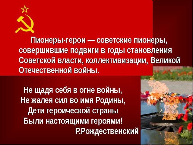 Но не только они: пионеры-герои — это советские пионеры, совершившие подвиги в годы становления Советской власти, коллективизации, Великой Отечественной войны, а также в мирное время.